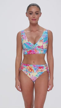 The Elsie Top is a cute crossover style. Its v neckline and wide straps provide just the right amount of coverage. The back stands out with a crisscross, interlacing tie detail. Shirring on the bust adds a soft and subtle accent. It also has an underwire and removable cups.