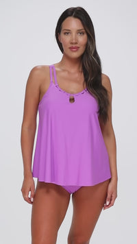 The Sadie Tankini has a flowy A-line silhouette and a high neckline. With soft cups and adjustable straps that can be converted to a crossback, this swim tank is ideal for anyone seeking comfort and style.