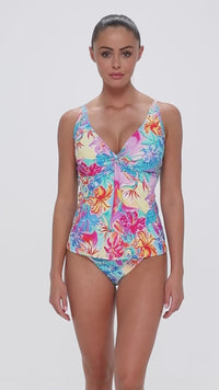 Get the look of a tank top, but with a hidden inner bra! the Forever Tankini is perfect for any woman who is seeking a fashionable top with a strong foundation. This twist tankini has a relaxed fit around the waist and provides full bust coverage and support. Special features include adjustable straps, underwire, a power net frame, removable cups, and a hidden hook-and-eye bra closure.