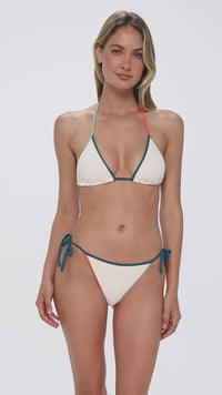 The Trisha Triangle gives a fresh spin to a classic bikini top. She features removable cups for custom shape and support, while her contrast binding delivers a playful pop. Soft, adjustable ties hold her in place, keeping you secure from surf to sunset.