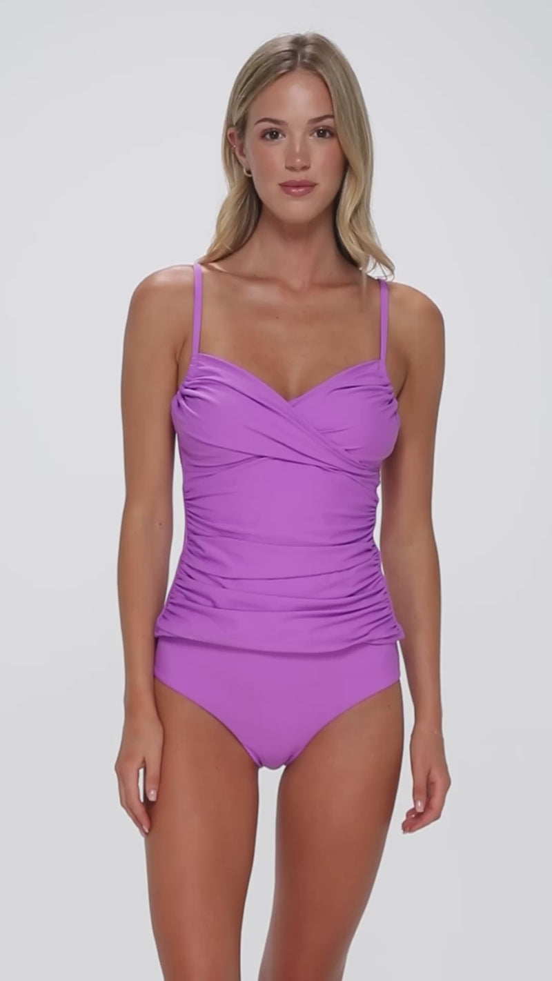 The Simone Tankini is sleek and sophisticated. With shirring along the sides and a flattering crossover neckline, this tankini is a summer staple! features include removable cups and over-the-shoulder adjustable straps that can be converted to a crossback.
