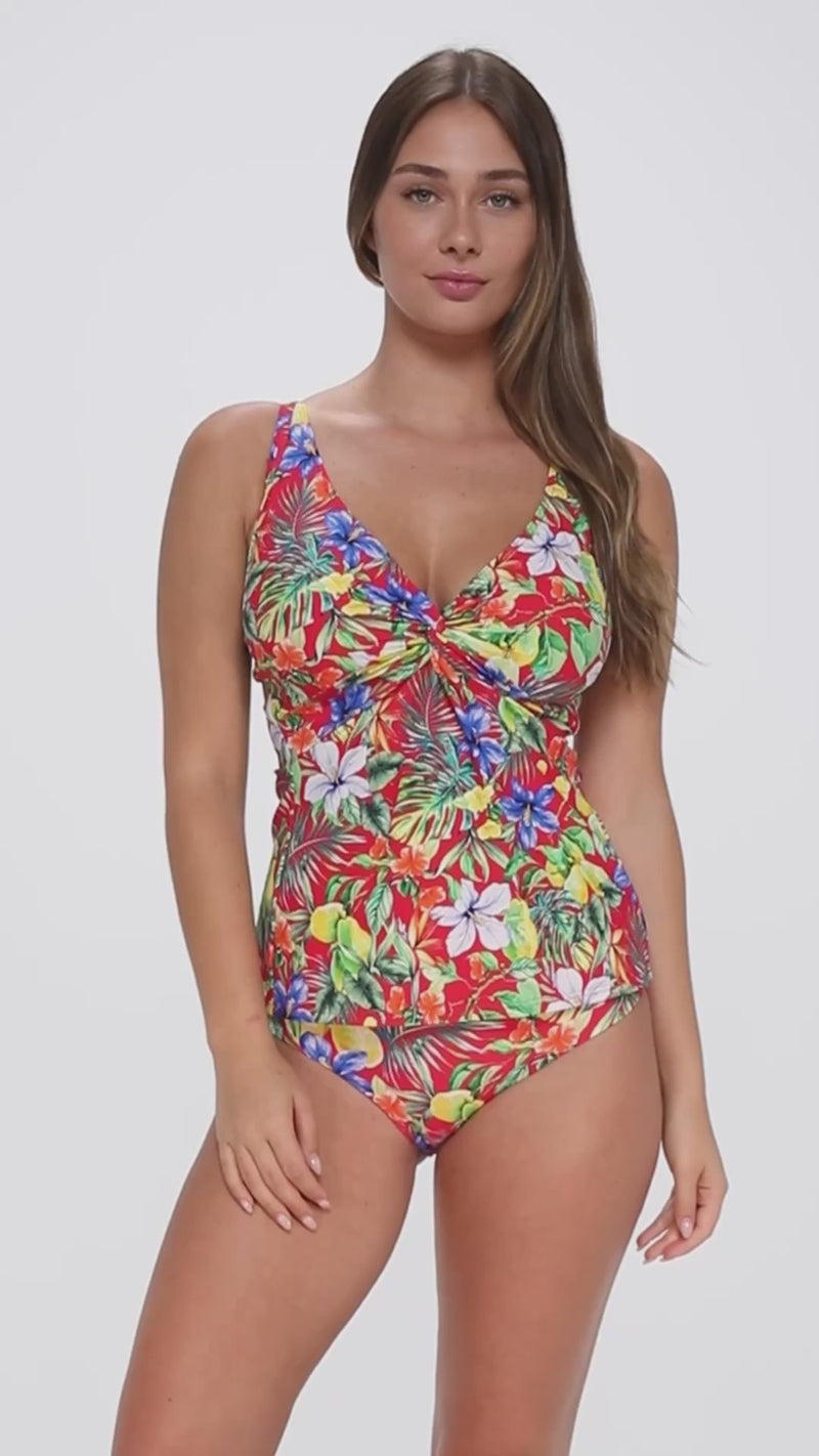 Get the look of a tank top, but with a hidden inner bra! The Forever Tankini is perfect for any woman who is seeking a fashionable top with a strong foundation. This twist tankini has a relaxed fit around the waist and provides full bust coverage and support. Special features include adjustable straps, underwire, a power net frame, removable cups, and a hidden hook-and-eye bra closure.