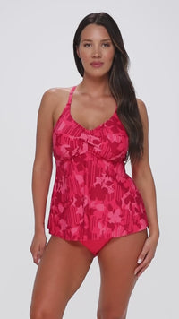 The Tori Tankini now has a J-hook! Delicate shirring and an extravagant twist bodice contrast with a flowy, loose-fitting body. This tankini also features removable cups, adjustable straps that can be converted to a crossback, and a back hook closure.