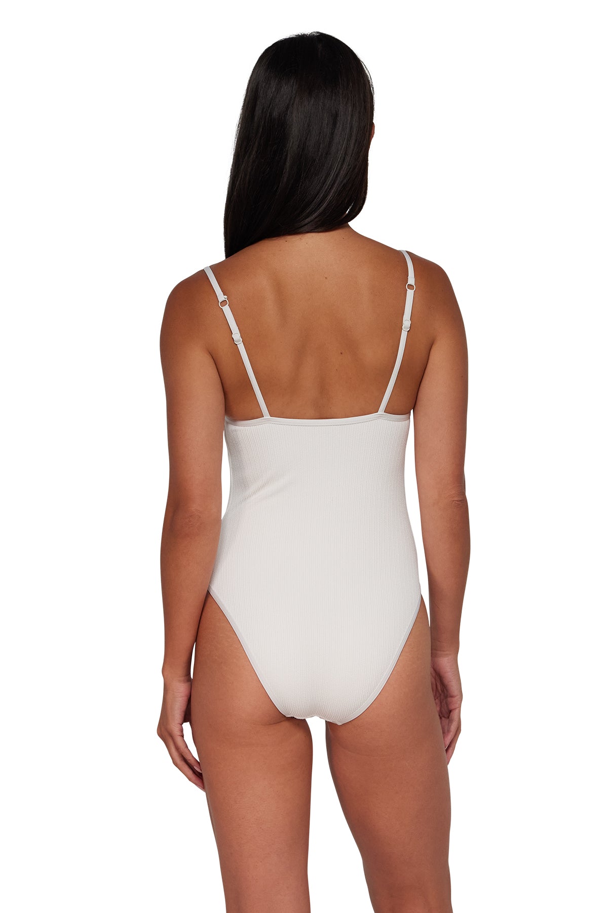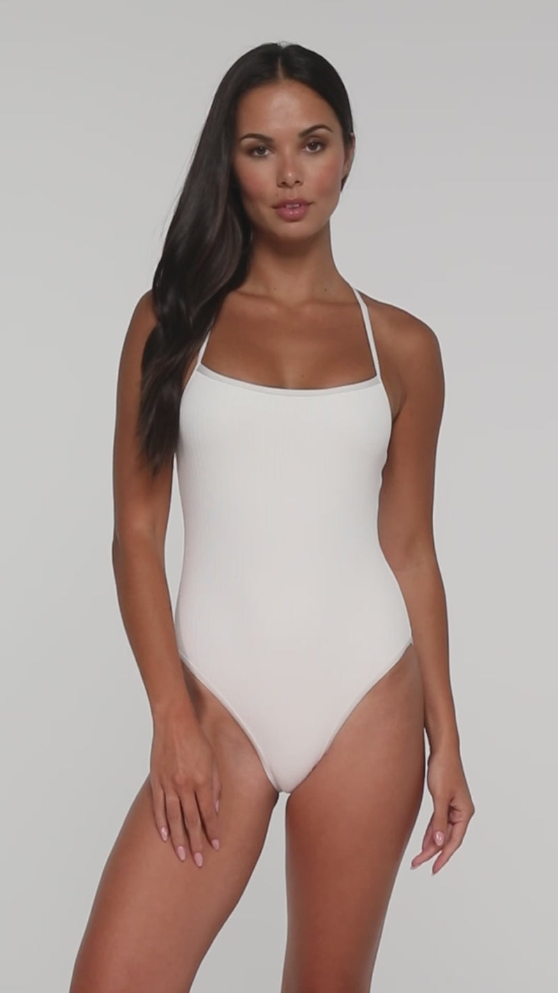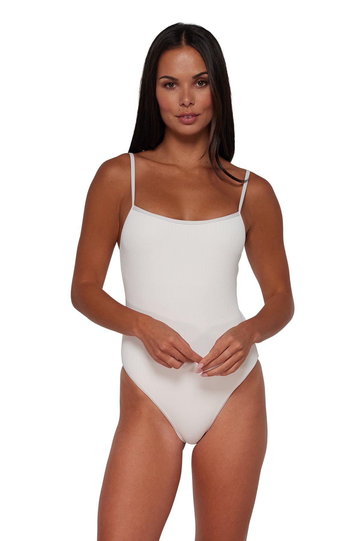 The Ariel One Piece with Trim brings adorable contrast binding to a classic silhouette! Crafted in our buttery soft scrunch fabric, this swimsuit has a high-cut leg and scoop neckline for a sleek lookâplus adjustable spaghetti straps, removable cups, a J-hook give for a personalized fit.